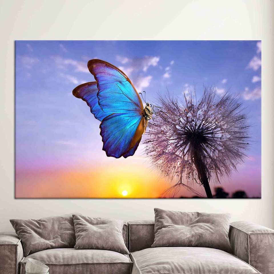 ผ้าใบพิมพ์ลาย: วิวพระอาทิตย์ขึ้นที่ดอกแดนดิไลออน - ของตกแต่งผนังที่มีสีสันสดใส, ผ้าใบห่อหุ้ม