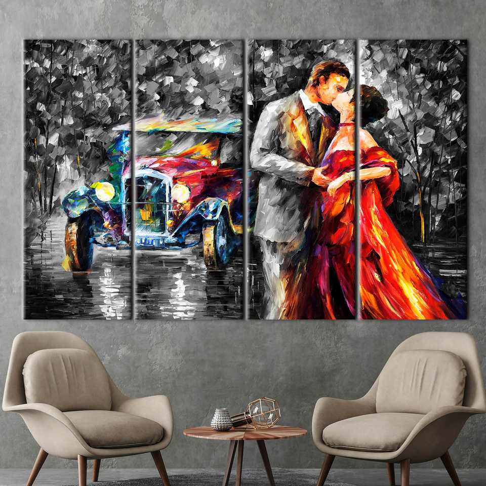ภาพพิมพ์บนผ้าใบ: ภาพศิลปะคู่รักจูบกันอย่างหรูหรา รถโบราณสุดโรแมนติก,4P: ภาพพิมพ์แบบห่อหุ้มสำหรับติดผนัง
