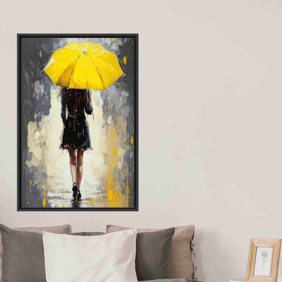 ผ้าใบพิมพ์ลาย: ผู้หญิงสง่างามพร้อมร่มสีเหลืองสำหรับตกแต่งผนัง กรอบสีดำ