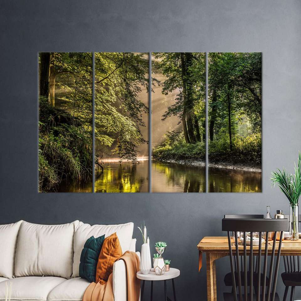 ภาพพิมพ์บนผ้าใบ: ทิวทัศน์ป่าไม้, ศิลปะแม่น้ำ, งานศิลปะสีเขียวสำหรับบ้าน,4P: ห่อหุ้มแบบแกลเลอรี