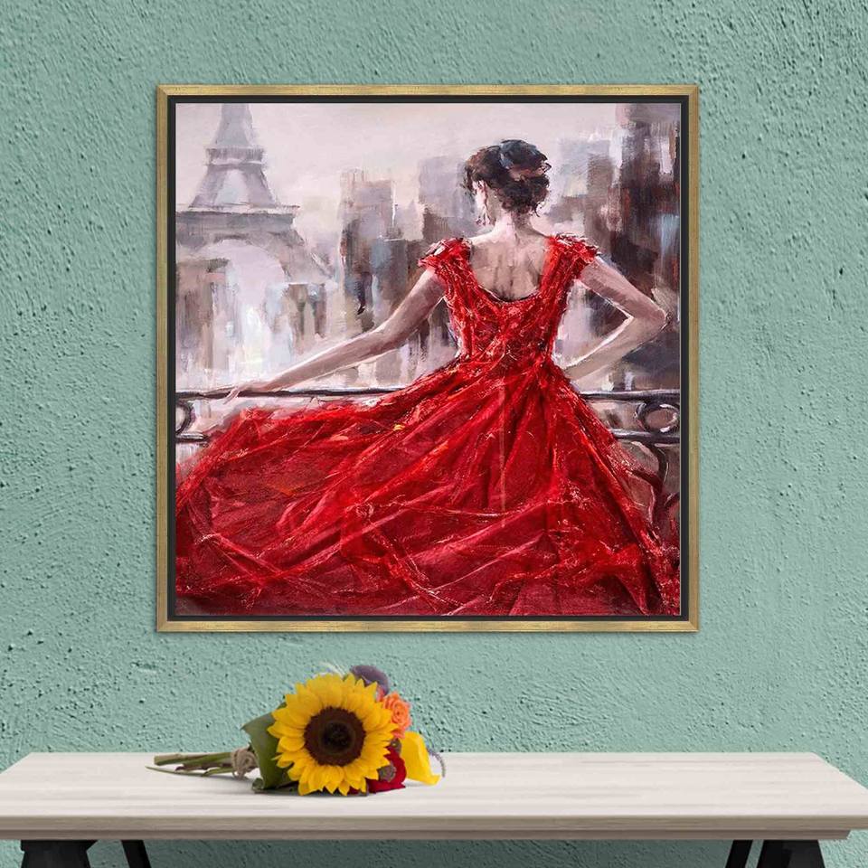 ภาพพิมพ์บนผ้าใบ: ภาพวาดคนหญิงในชุดสีแดงในกรุงปารีส, ผ้าใบกรอบทอง