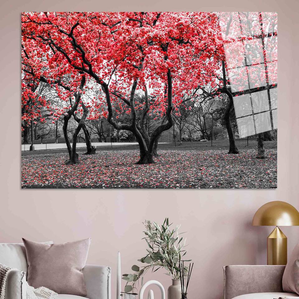ผ้าใบพิมพ์ลาย: ภาพศิลปะต้นไม้ดอกไม้สีแดงสำหรับตกแต่งห้องนอนอย่างหรูหรา, ศิลปะบนกระจกนิรภัย
