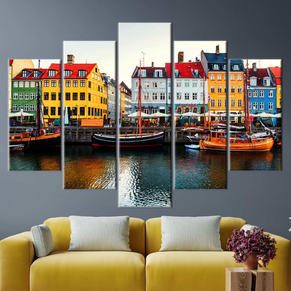 ภาพพิมพ์บนผ้าใบสำหรับตกแต่งผนัง: วิวเดนมาร์ก นีฮาวน์ โคเปนเฮเกน 5 ชิ้น คละแบบ: ภาพพิมพ์แบบห่อหุ้ม