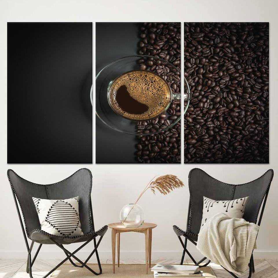 ภาพพิมพ์บนผ้าใบสำหรับตกแต่งผนัง: ของตกแต่งร้านกาแฟลายถ้วยกาแฟสุดหรู ผ้าใบพิมพ์ลาย 3 ชิ้น
