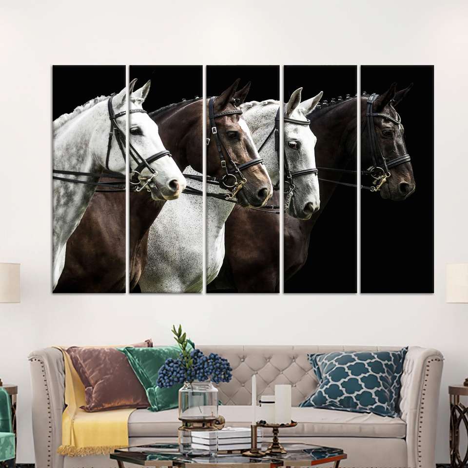 ภาพพิมพ์บนผ้าใบสำหรับตกแต่งผนัง: ม้าขี่ม้าที่สง่างามในโทนสีขาวและสีน้ำตาล ชุดผ้าใบ 5 ชิ้น