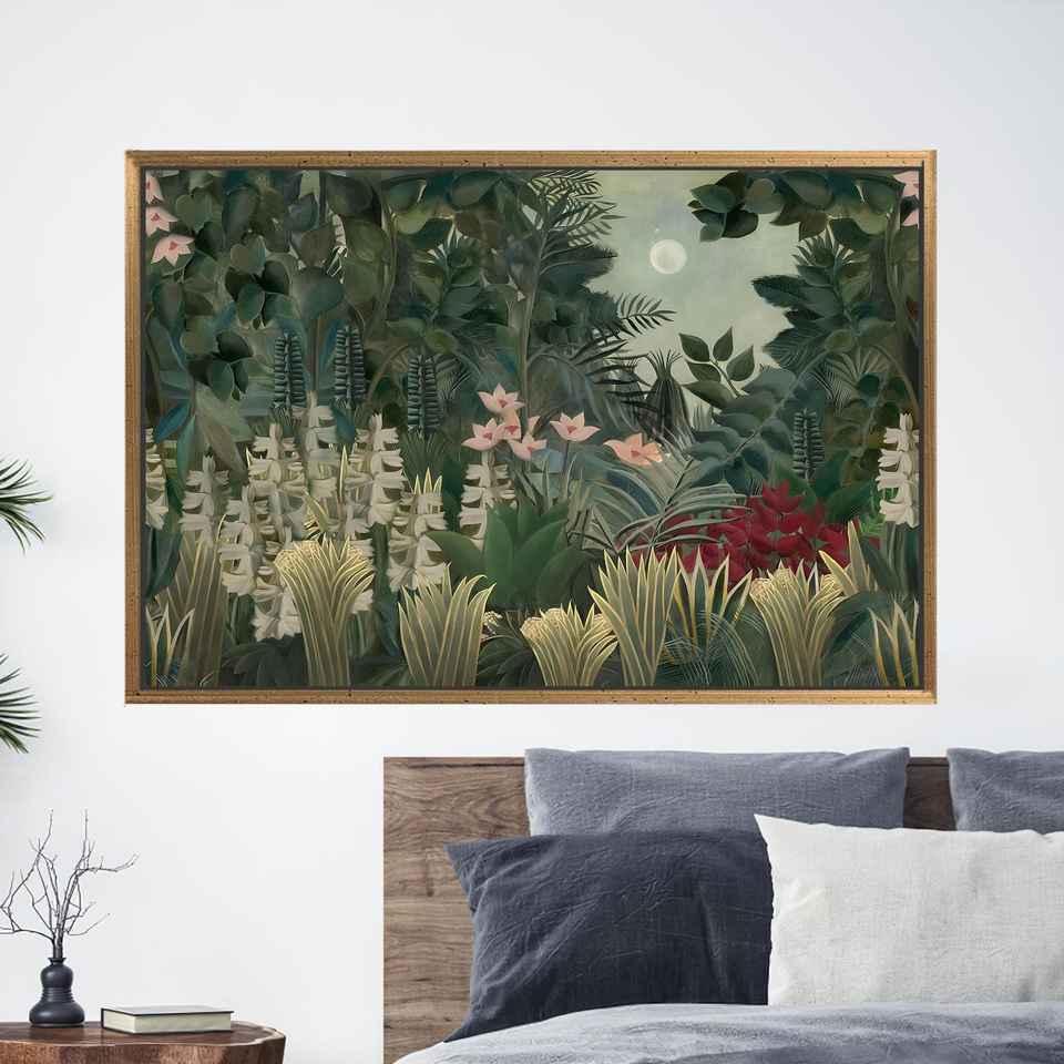 ภาพพิมพ์บนผ้าใบสำหรับตกแต่งผนัง: ภาพตกแต่งป่าที่เต็มไปด้วยความเขียวขจีใต้แสงจันทร์ 1P: กรอบสีทอง