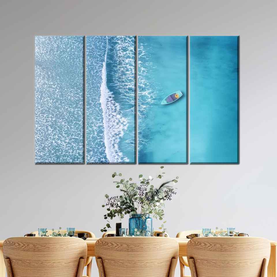 ภาพพิมพ์บนผ้าใบสำหรับตกแต่งผนัง: ภาพตกแต่งชายฝั่งทะเลสีเทอร์ควอยซ์พร้อมเรือคายัค,4P: ภาพพิมพ์แบบห่อหุ้มสำหรับตกแต่งผนัง