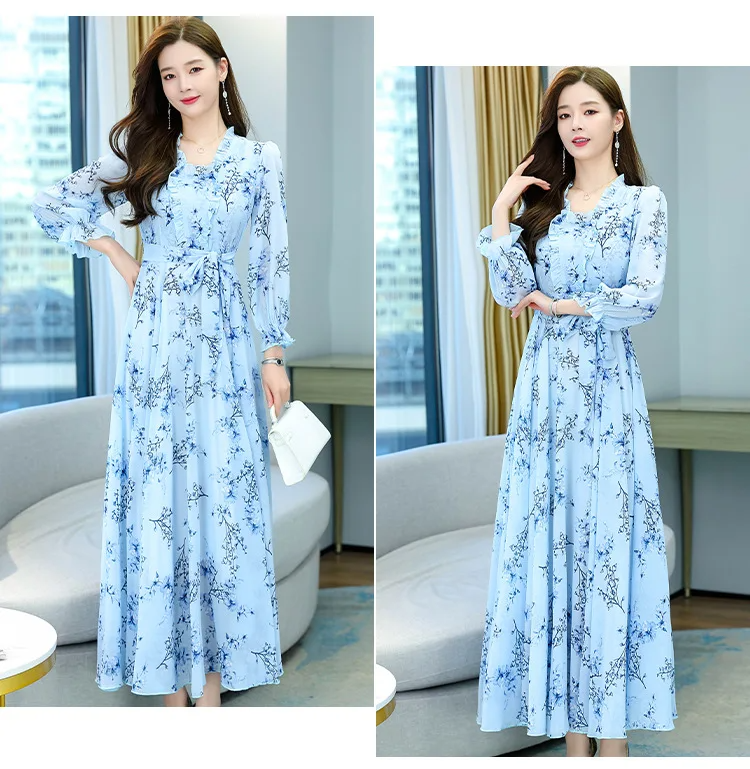 ชุดเดรสยาวพิมพ์ลายดอกไม้ คอเหลี่ยม แขนยาว ผ้าชีฟองจีบระบาย สไตล์อังกฤษ กันยับ ระบายอากาศได้ดี เหมาะสำหรับฤดูใบไม้ผลิ