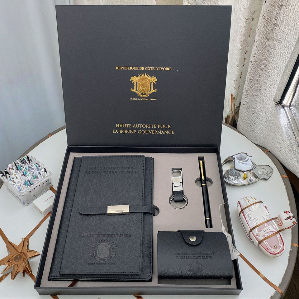 ชุดกล่องของขวัญพิมพ์ลาย สมุดโน้ตหนัง PU พร้อมพวงกุญแจ กระเป๋าใส่บัตร ปากกาโลหะ พร้อมโลโก้ตามสั่ง