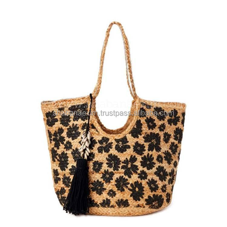 กระเป๋าผ้าปอกระเจาถักลายดอกไม้สีเขียวอเนกประสงค์สำหรับเดินทางปอกระเจาถักด้วยมือพร้อมสายรัด