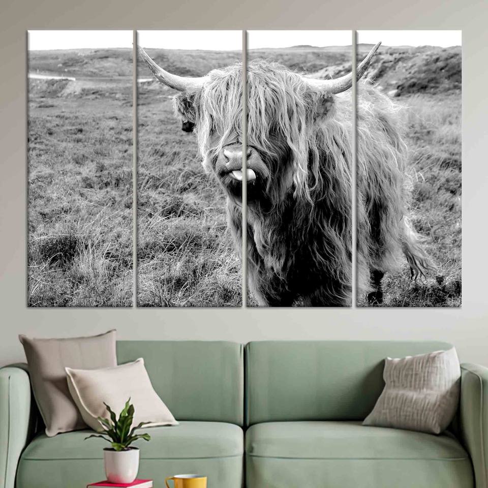 ภาพพิมพ์ลายวัวไฮแลนด์บนผ้าแคนวาส: ของตกแต่งผนังลายวัวสก็อตแลนด์ ชุดผ้าแคนวาส 4 ชิ้น