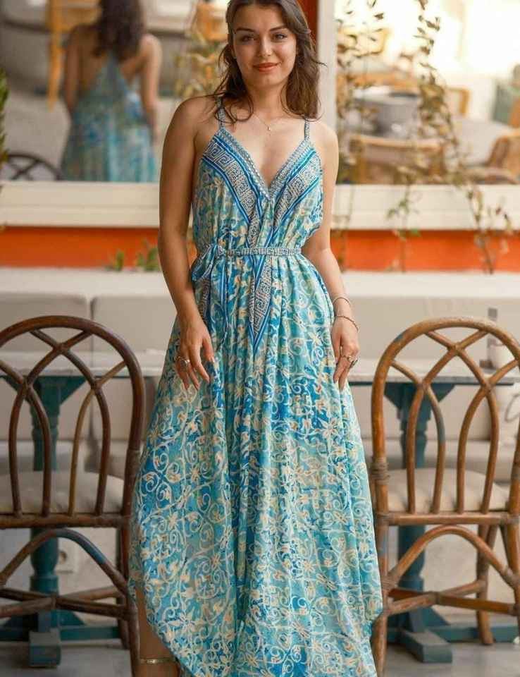 ชุดเดรสยาวพิมพ์ลายลูกไม้โพลีเอสเตอร์สีฟ้าอมเขียว ทรงเข้ารูป เปิดหลัง คอวี แขนกุด สไตล์โบฮีเมียน สำหรับงานปาร์ตี้ริมชายหาดฤดูร้อน เป็นมิตรต่อสิ่งแวดล้อม เซ็กซี่