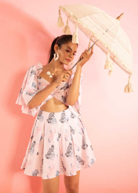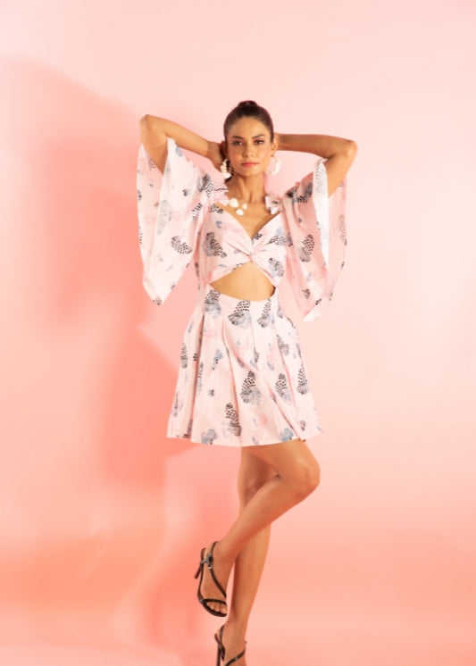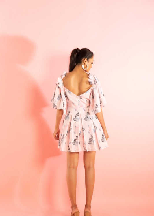 มินิเดรสพิมพ์ลายพร้อมดีเทลระบายที่ไหล่ ชุดลำลองสำหรับผู้หญิง ผลิตจากผ้าเนื้อบางเบา สวมใส่สบาย กระชับรูปร่าง