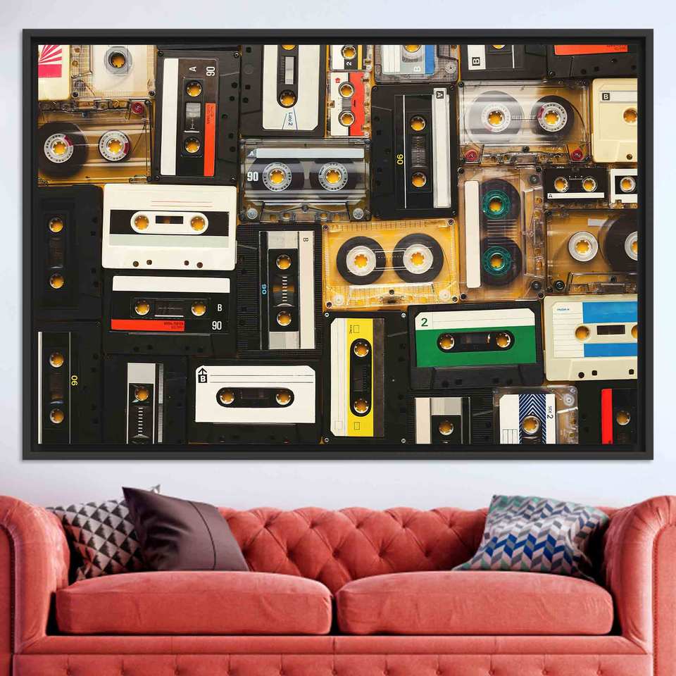 ภาพพิมพ์บนผ้าใบลายเทปคาสเซ็ตแบบเรโทร - ของตกแต่งห้องดนตรี, ผ้าใบกรอบสีดำ