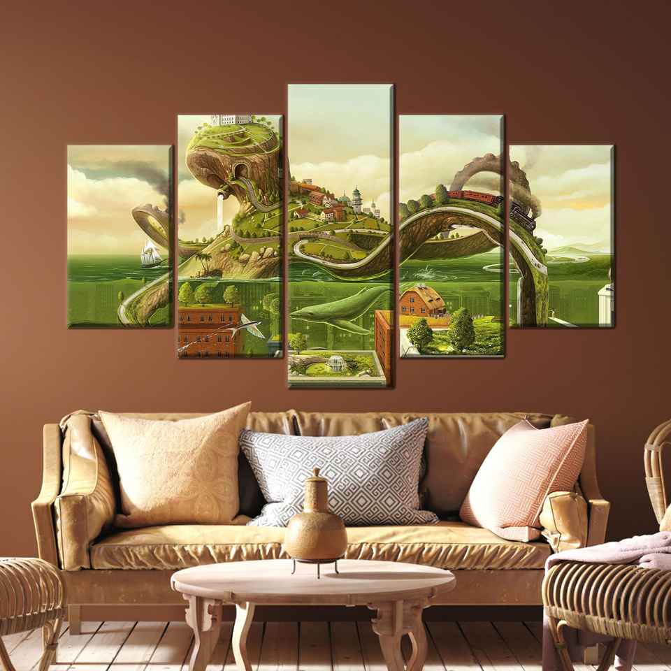 งานศิลปะบนผืนผ้าใบพิมพ์ลายการเดินทางด้วยรถไฟในโลกแฟนตาซีที่สวยงาม 5 ชิ้น คละแบบ: แกลเลอรีแรป