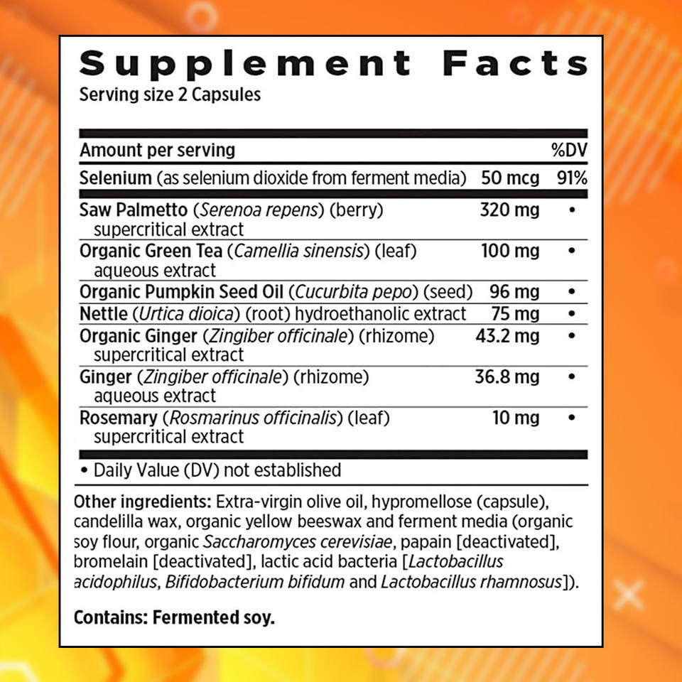 ใบเลื่อย Palmetto, รากตำแยที่ถูกกัด, สารสกัดจากเมล็ดฟักทอง, ขิงอินทรีย์, โรสแมรี่, ชาเขียว, ซีลีเนียม