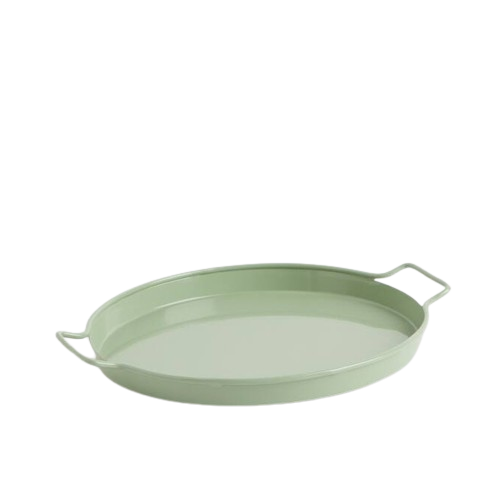ถาดเสิร์ฟโลหะแบรนด์ส่วนตัว พร้อมเคลือบสีเขียวทั้งตัว สำหรับวางบนฐานแบบออตโตมัน ราคาขายส่งจากโรงงานโดยตรง