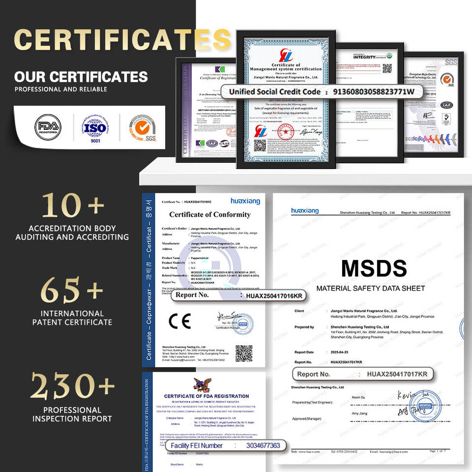 น้ำมันแพทชูลี่, น้ำมันเปปเปอร์มินต์, น้ำมันส้มหวาน, น้ำมันมะนาว, น้ำมันยูคาลิปตัส, น้ำมันสเปียร์มินต์, น้ำมันวินเทอร์กรีน, น้ำมันตะไคร้หอม, น้ำมันไธม์, น้ำมันอบเชย, น้ำมันโป๊ยกั๊ก, น้ำมันเปลือกส้ม, น้ำมันขิง, น้ำมันส้มแมนดาริน, น้ำมันลาเวนเดอร์, น้ำมันทีทรี, น้ำมันโรสแมรี่, น้ำมันไซเปรส, น้ำมันกานพลู, น้ำมันบอระเพ็ด, น้ำมันยูคาลิปตัสผสมเลมอน, น้ำมันออริกาโน, น้ำมันใบงาขี้ม้อน, น้ำมันหอมระเหยไม้จันทน์, น้ำมันเสจ, น้ำมันซีดาร์, น้ำมันตะไคร้, น้ำมันหญ้าฝรั่น, น้ำมันหอมระเหยเบอร์กาม็อท, น้ำมันเจอเรเนียม, น้ำมันกุหลาบ, น้ำมันกำยาน, น้ำมันดอกเบญจมาศ, น้ำมันวานิลลา, น้ำมันกฤษณา, น้ำมันดาวเรือง, น้ำมันมะลิ, น้ำมันลอเรล, น้ำมันคาโมมายล์, น้ำมันเนโรลีส่วนผสม