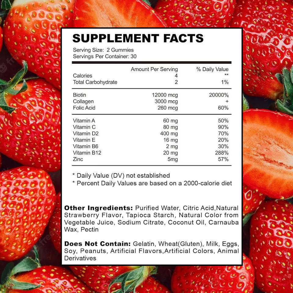 Biotin, Collagen, Folic Acid, Vitamin C, Vitamin A, Vitamin D2, Vitamin E, Vitamin B12, Vitamin B6, Zinc