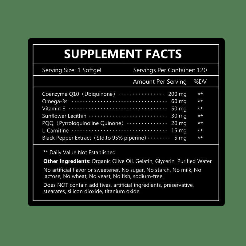 โคเอนไซม์ Q10, โอเมก้า-3, วิตามินอี, ดอกทานตะวันเลซิติน, Pqq, แอล-คาร์นิทีน, สารสกัดพริกไทยดำส่วนผสมหลัก