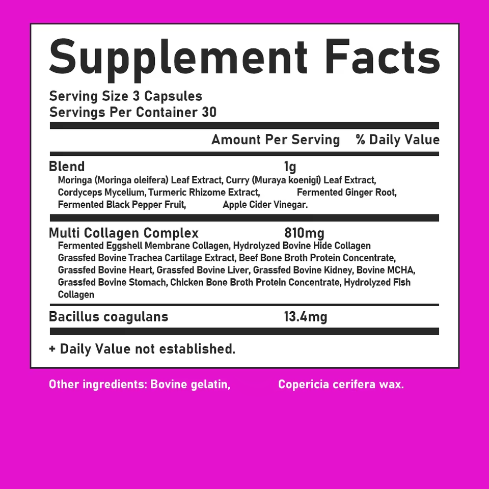 ส่วนผสมหลัก:มัลติ คอลลาเจน คอมเพล็กซ์, สารสกัดจากใบมะรุม, สารสกัดจากใบแกง, สารสกัดจากรากขมิ้นชัน