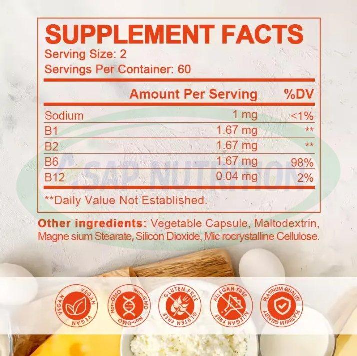 แคปซูลประกอบวิตามินบีแคปซูลอาหารเสริมเพื่อสุขภาพ B6วิตามินบีแคปซูล B1ฉลากส่วนตัว