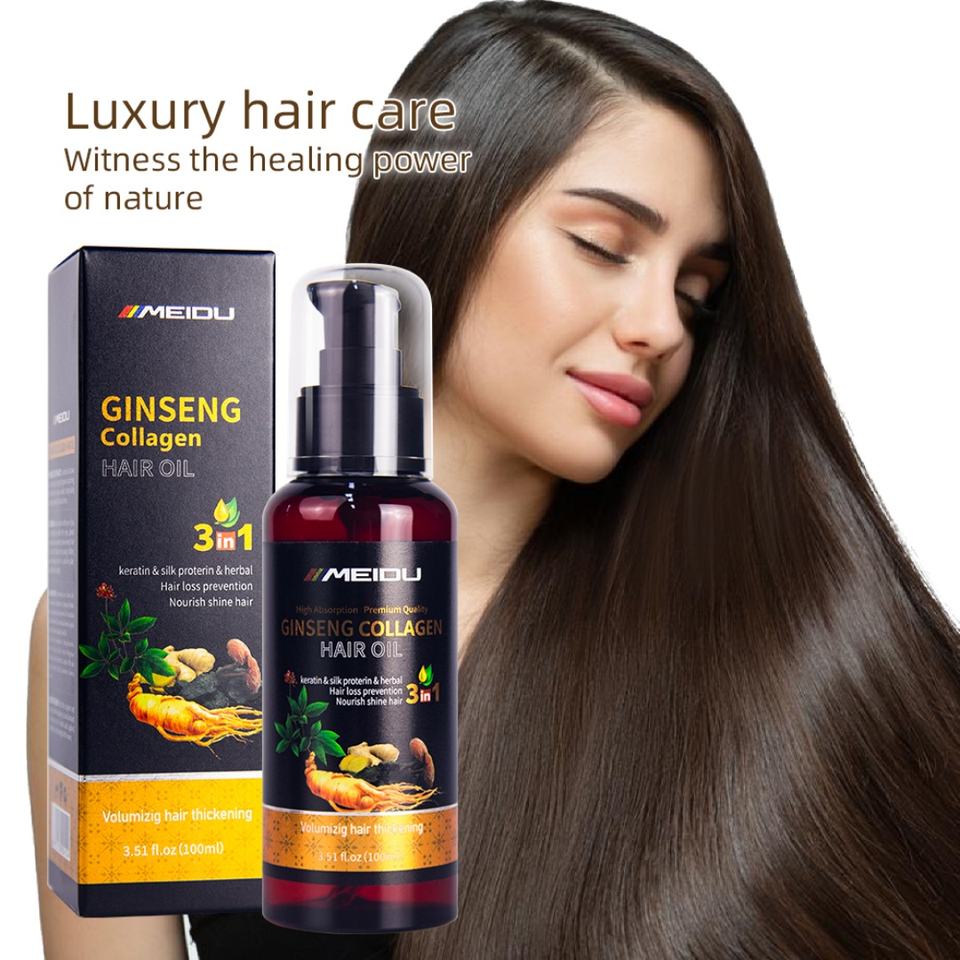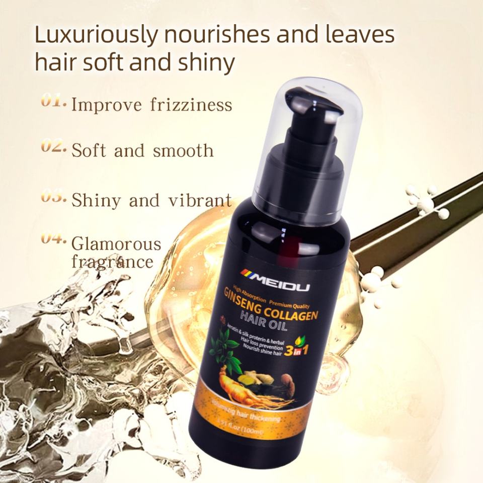 น้ำมันบำรุงผมสูตรสมุนไพรผสมคอลลาเจน โสม เคราติน ขิง ยี่ห้อ MEIDU (ฉลากส่วนตัว)