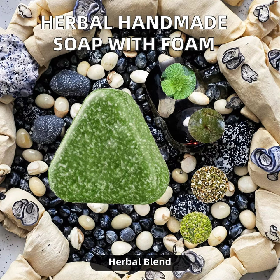 สบู่สมุนไพรธรรมชาติยูสมาน สำหรับผมร่วง สบู่ทำมือ รูปทรงสามเหลี่ยม สีเขียวเจ็ดสี สำหรับทุกเพศทุกสภาพผม