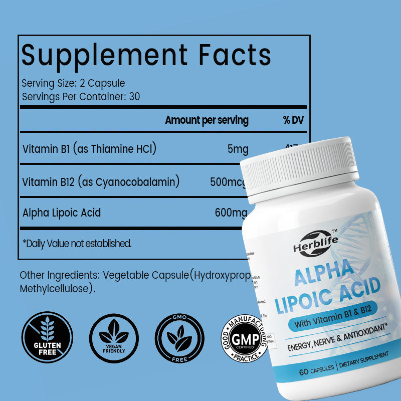 แคปซูลอัลฟาไลโปอิกแอซิด 600 มก. แบรนด์ส่วนตัว (OEM) อาหารเสริม ALA สำหรับระบบประสาท พลังงาน และสารต้านอนุมูลอิสระ