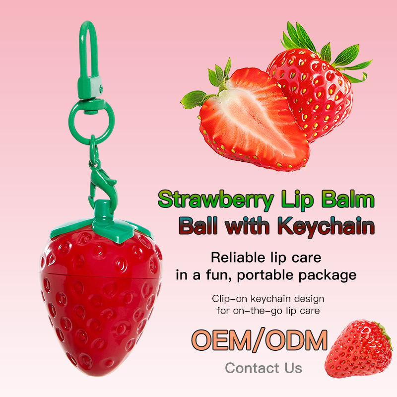 ลิปบาล์มรูปทรงสตรอว์เบอร์รี่แบบพวงกุญแจ บำรุงริมฝีปาก ช่วยฟื้นฟูริมฝีปากแตก ให้ความชุ่มชื้น เรียบเนียน และอวบอิ่ม รับผลิตแบบ OEM ODM แบรนด์ส่วนตัว