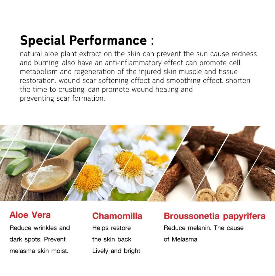 ว่านหางจระเข้, เชียบัตเตอร์, กลีเซอรีน, วิตามินซี, ARBUTIN, โสมจีน, วิตามินอี, คอลลาเจน, RETINOL, Peptide, วิตามิน B5ส่วนผสมหลัก