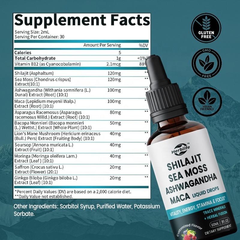 ชิลลาจิตแบบหยดฉลากส่วนตัว OEM ผสมสาหร่ายทะเล, อัชวาคันธา, ซิงค์, แมกนีเซียม วิตามินเหลวสำหรับผู้หญิงและผู้ชาย