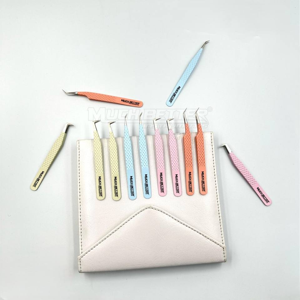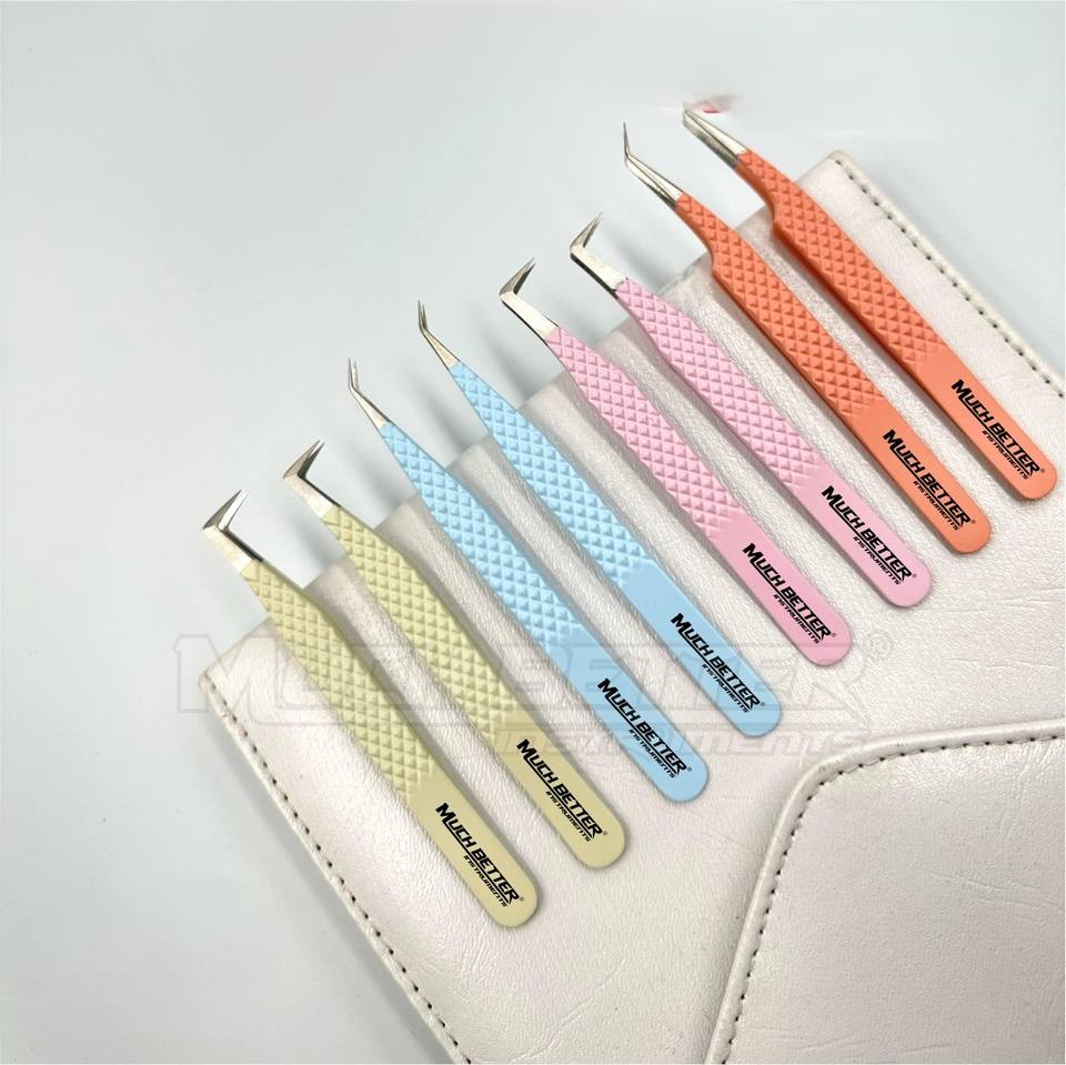 แหนบปลายต่อขนตาแหนบปลายไฟเบอร์สีชมพูเงินสีทองฉลากตามแบบ