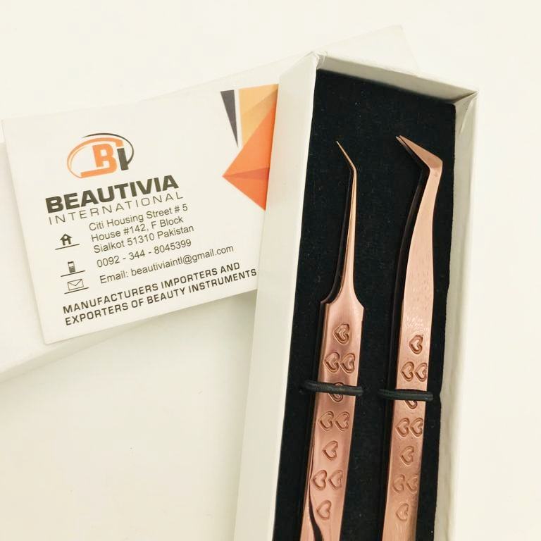 แหนบถอนขนตาสแตนเลสปลายแหลมแบบมืออาชีพฉลากตามสั่งสีโรสโกลด์พร้อมอุปกรณ์ต่อขนตาพิมพ์รูปหัวใจ