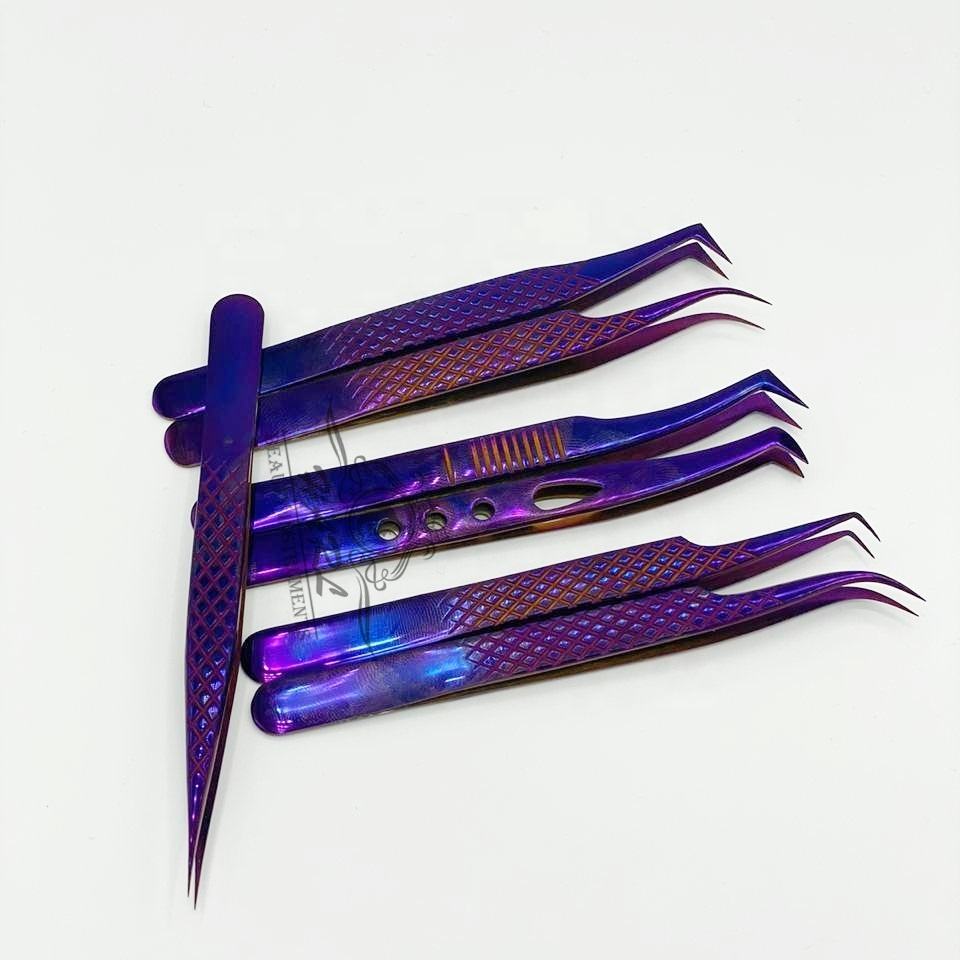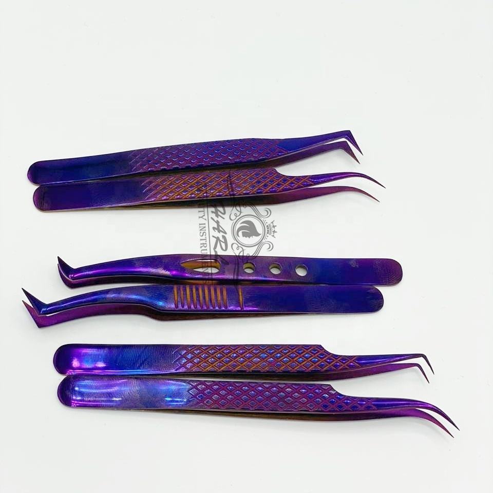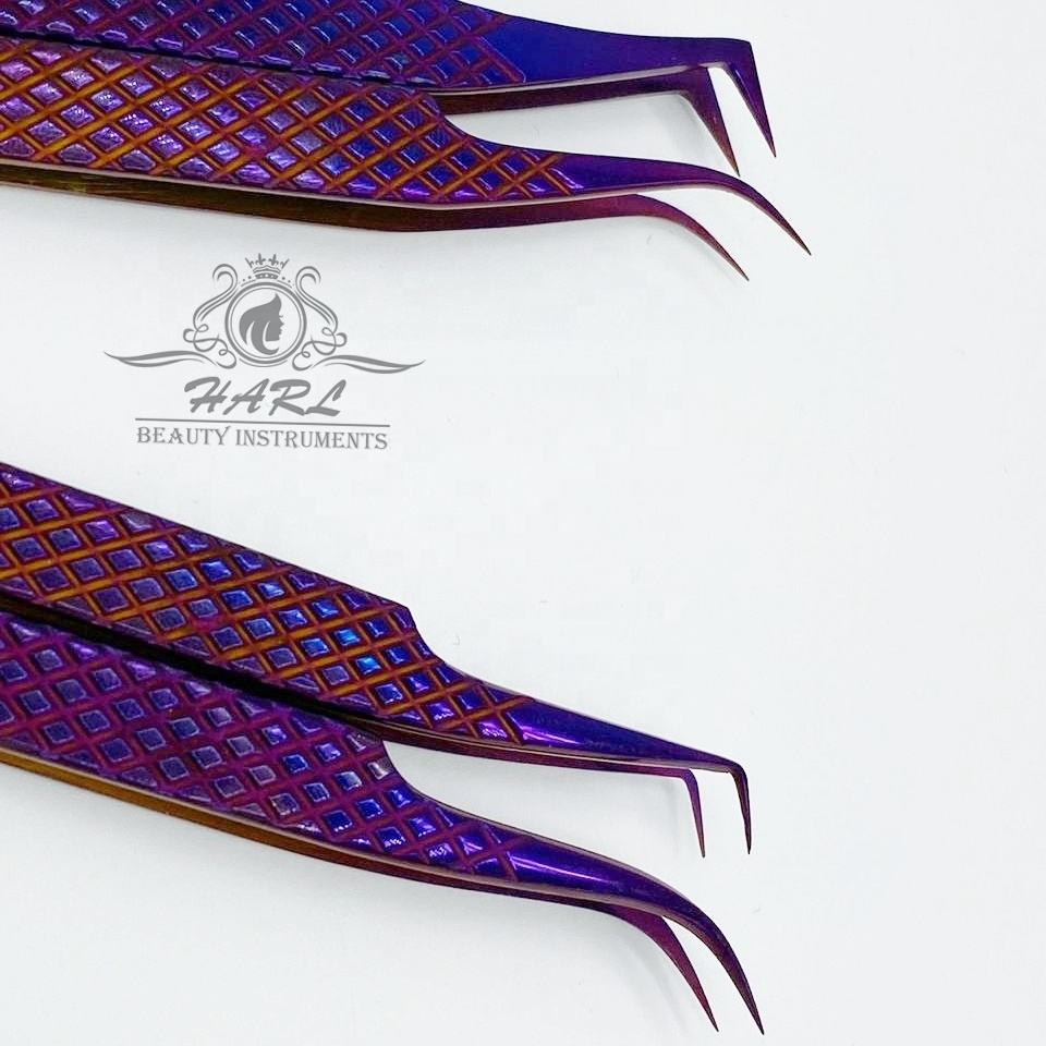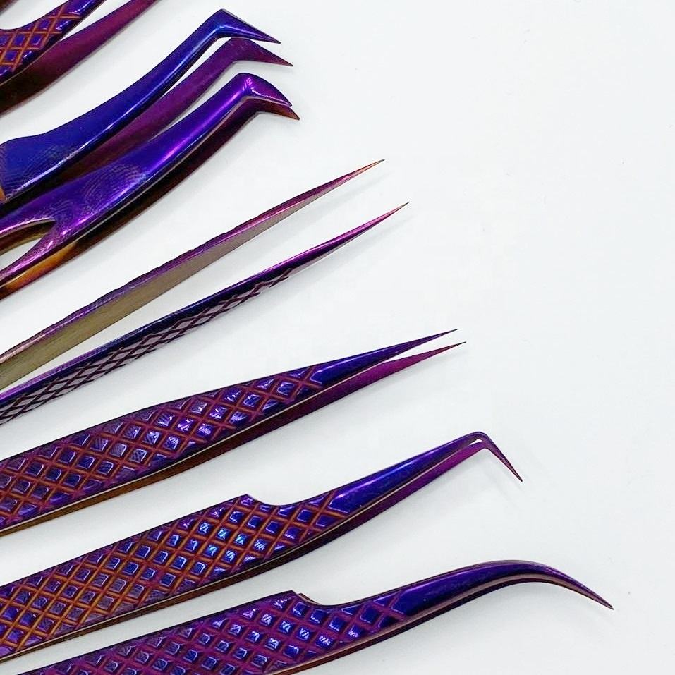 แหนบต่อขนตาสแตนเลสสีม่วงอุปกรณ์เพิ่มความหนาของ90/75องศาสำหรับขนตาคิ้วเพื่อความงามฉลากตามต้องการ