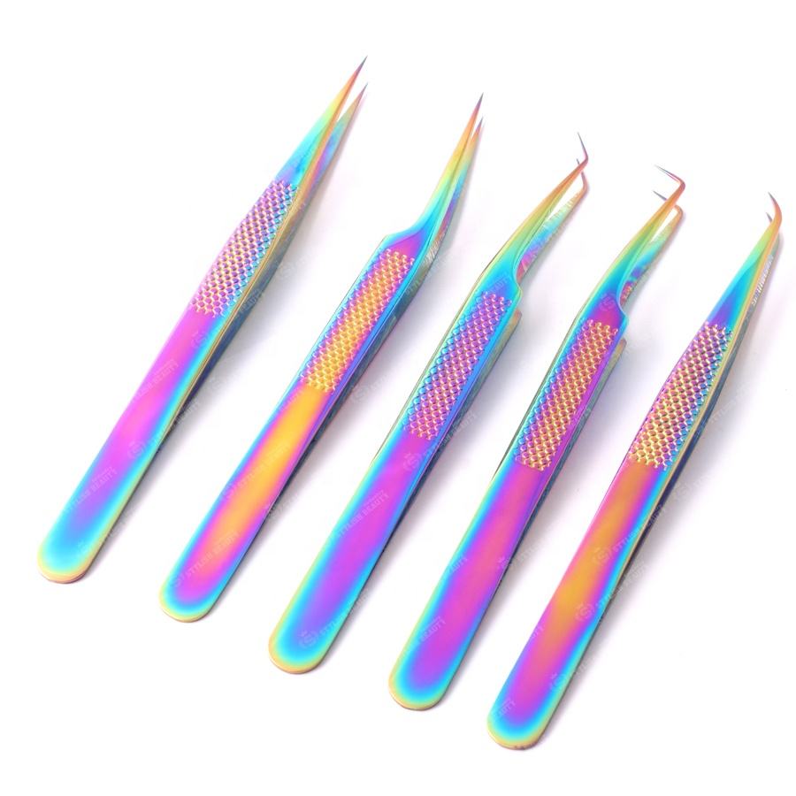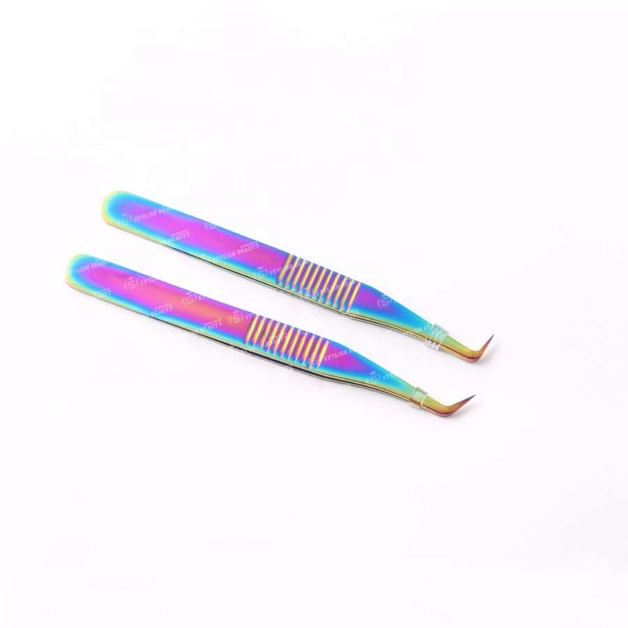 แหนบต่อขนตาสแตนเลสแบบโค้งแข็งแรงสีรุ้งติดแบรนด์สินค้าเอง
