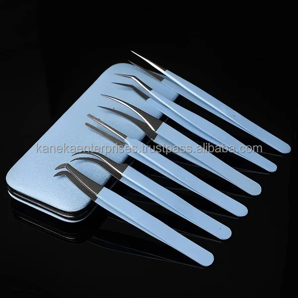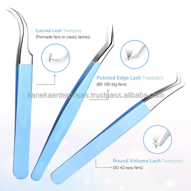 แหนบขนตาสแตนเลสแบบมืออาชีพน้ำหนักเบาแหนบต่อขนตาเพิ่มวอลลุ่มสีน้ำเงินและสีดำฉลากตามต้องการ