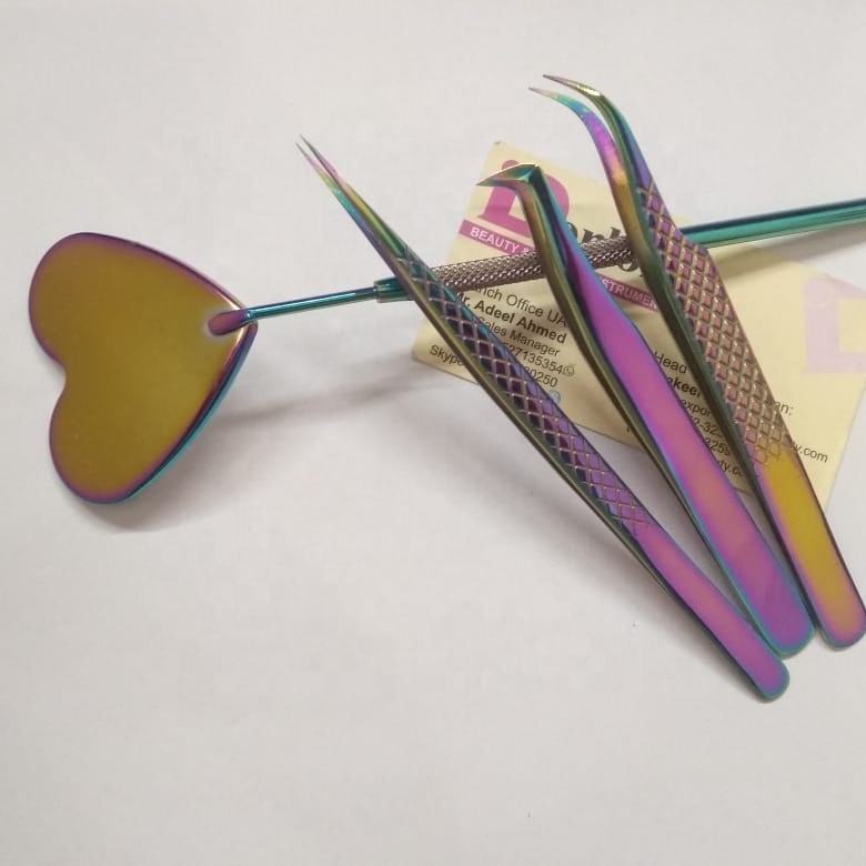 Private Label Stainless Steel Rainbow Plasma Eyelash Extension Tweezers Heart Shaped Volume Isolation Mirror