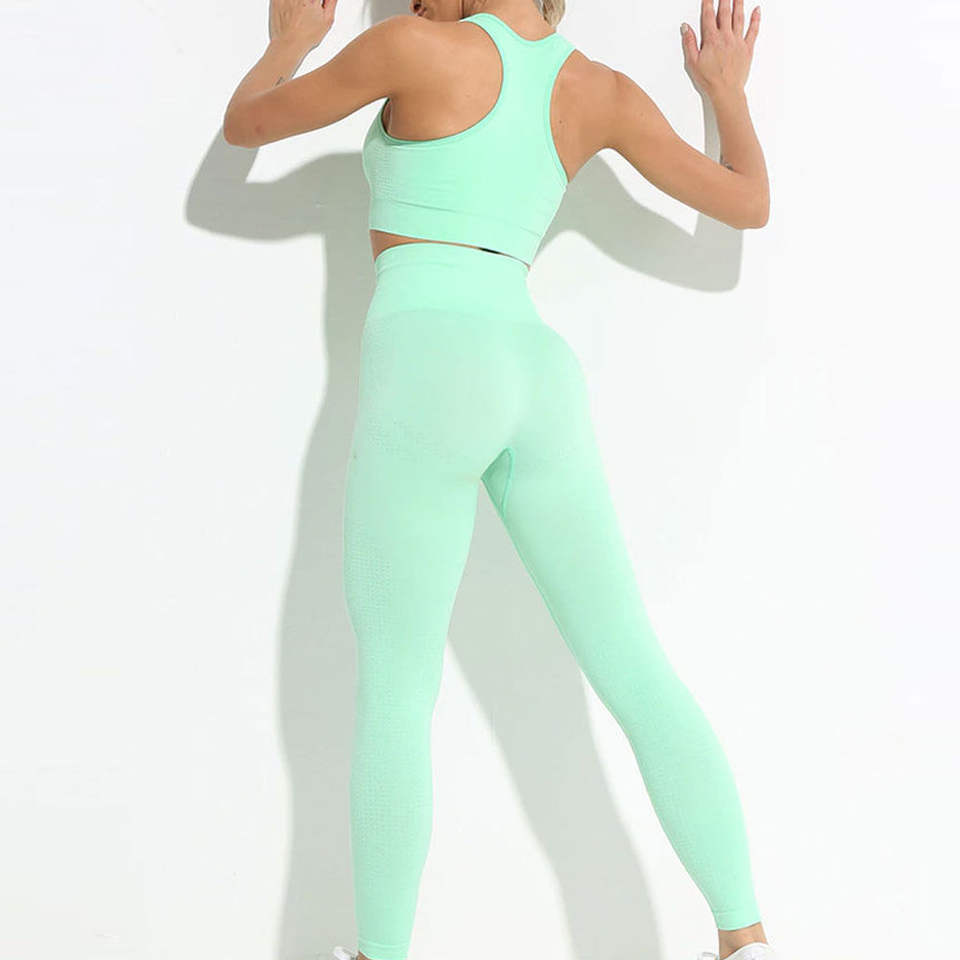 ชุดโยคะผู้หญิงสำหรับใช้งานกลางแจ้ง แบรนด์ส่วนตัว ผลิตจากผ้าสแปนเด็กซ์/โพลีเอสเตอร์ เนื้อผ้าทึบ ระบายอากาศได้ดี แห้งเร็ว เป็นมิตรกับสิ่งแวดล้อม ชุด 2 ชิ้น ด้านหน้า รุ่น 2025