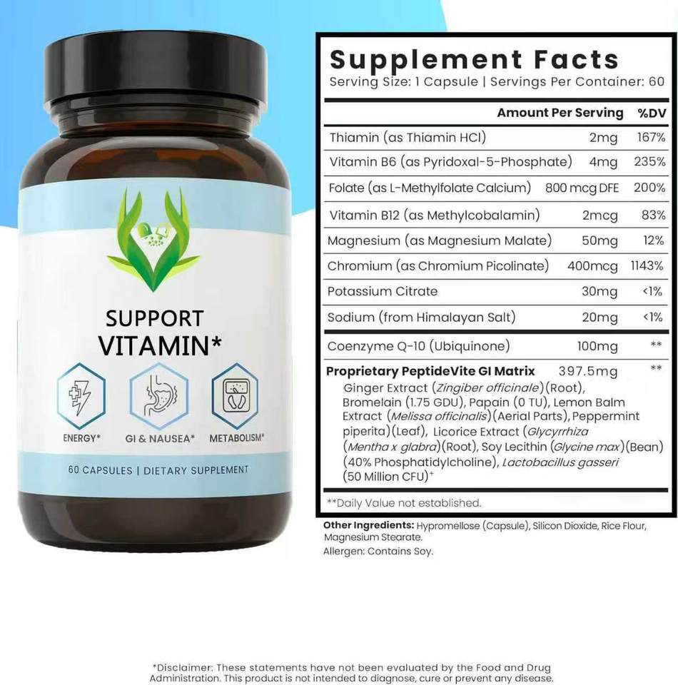 ไทอามิน, วิตามินบี 6, โฟเลต, วิตามินบี 12, โครเมียม, โพแทสเซียมซิเตรต, โซเดียม, โคเอนไซม์ คิว-10, PeptideVite Gl Matrix ที่เป็นกรรมสิทธิ์