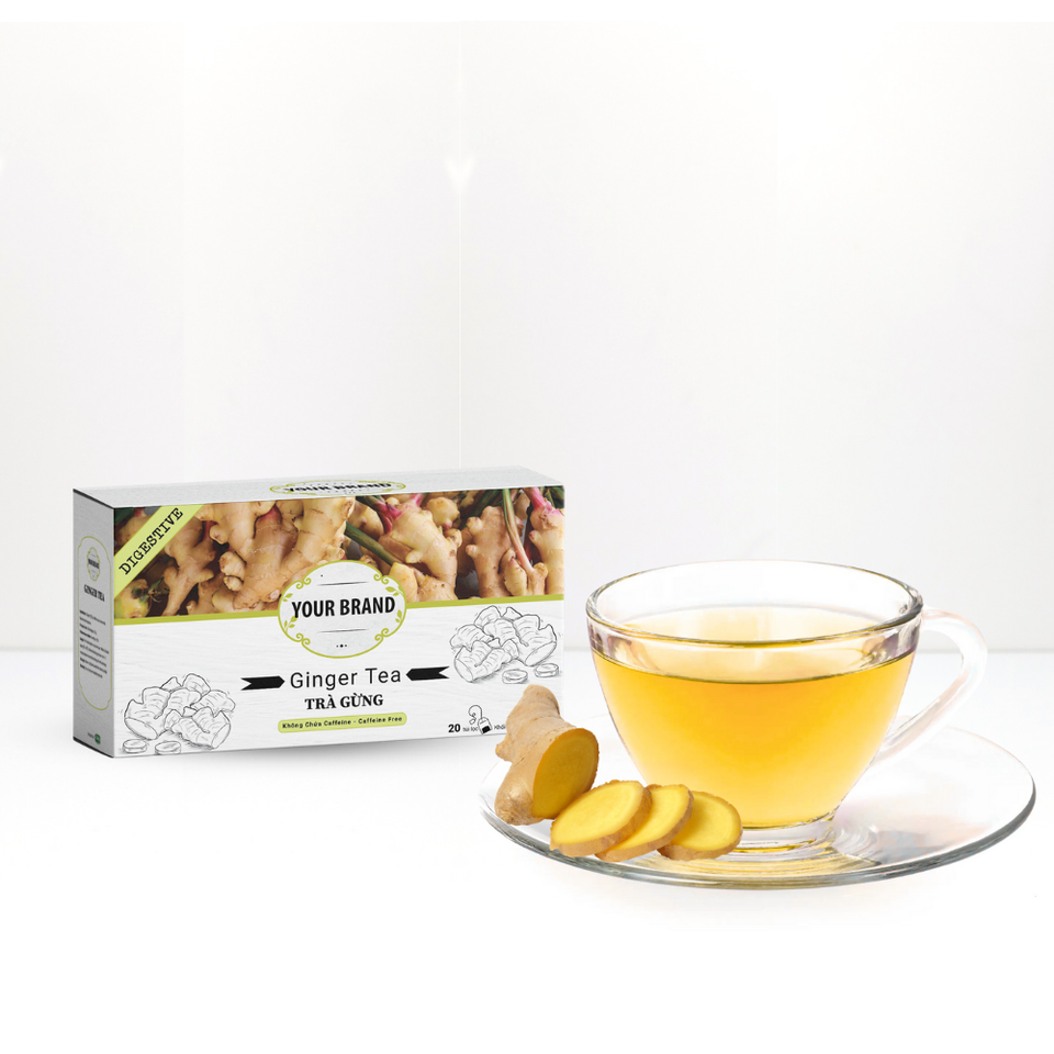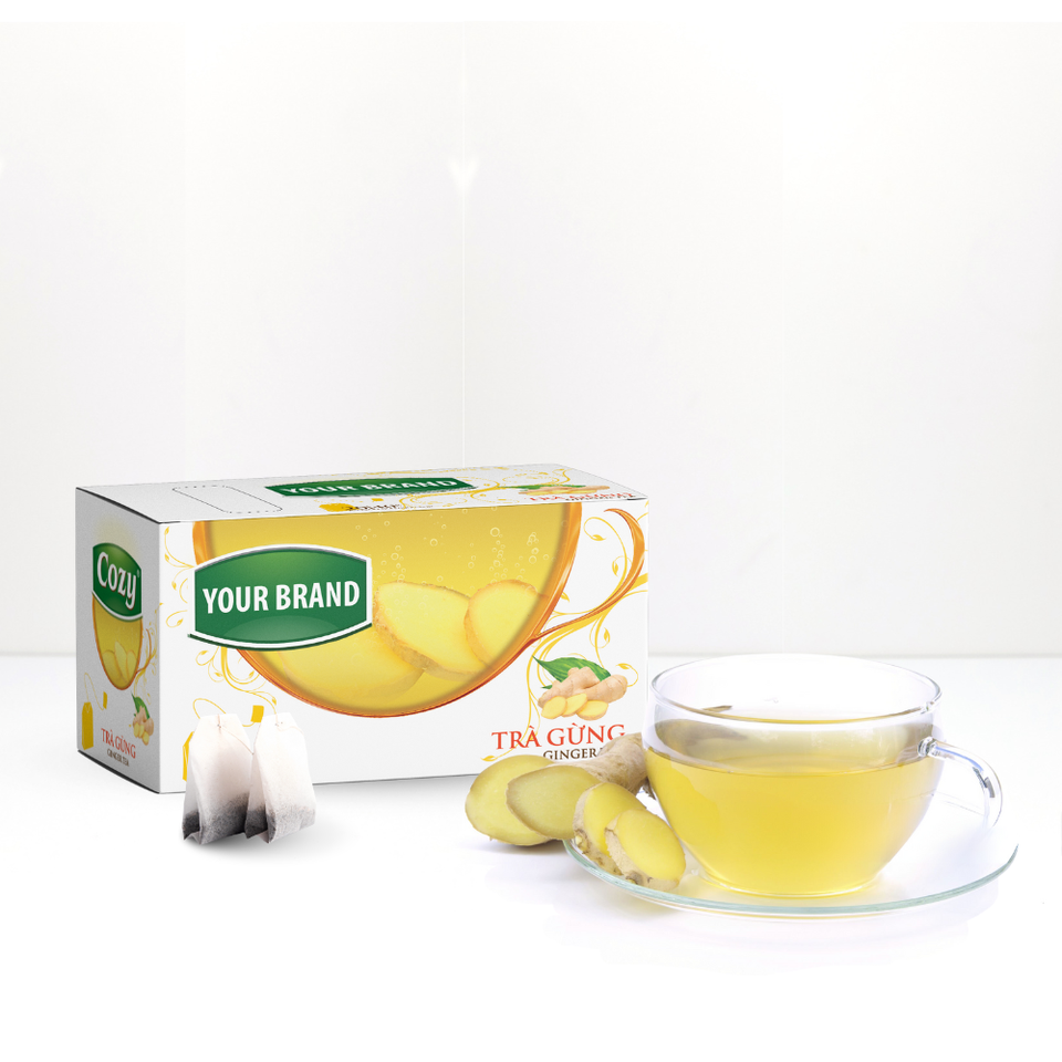 ถุงชาสมุนไพรผสมผลไม้ขิงพร้อมป้ายโลโก้ผู้จัดจำหน่ายชาแสนสบายออกแบบได้ตามต้องการ