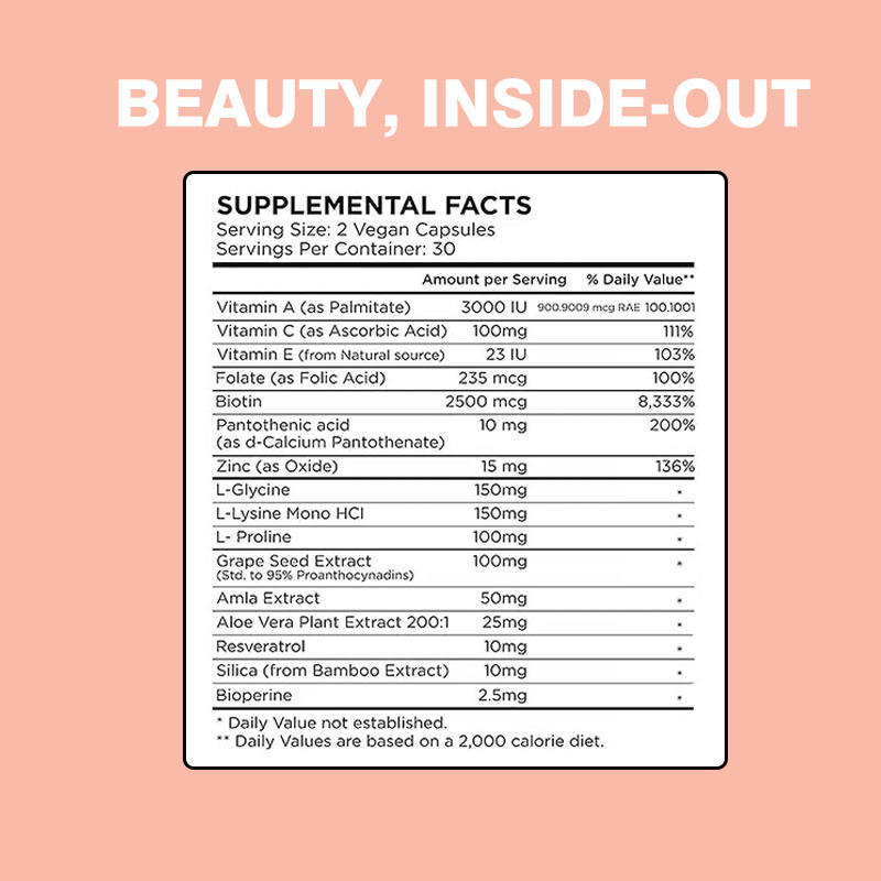 ส่วนผสมหลัก:วิตามินซี, สังกะสี, วิตามินเอ, วิตามินอี, โฟเลต, ไบโอติน, กรดแพนโทธีนิก, แอล-ไกลซีน, แอล-ไลซีนโมโนเอชชี่, แอล-โพรไลน์, สารสกัดจากเมล็ดองุ่น, สารสกัด Amla, สารสกัดจากพืชว่านหางจระเข้, เรสเวอราทรอล, ซิลิกา, ไบโอเพอรีน