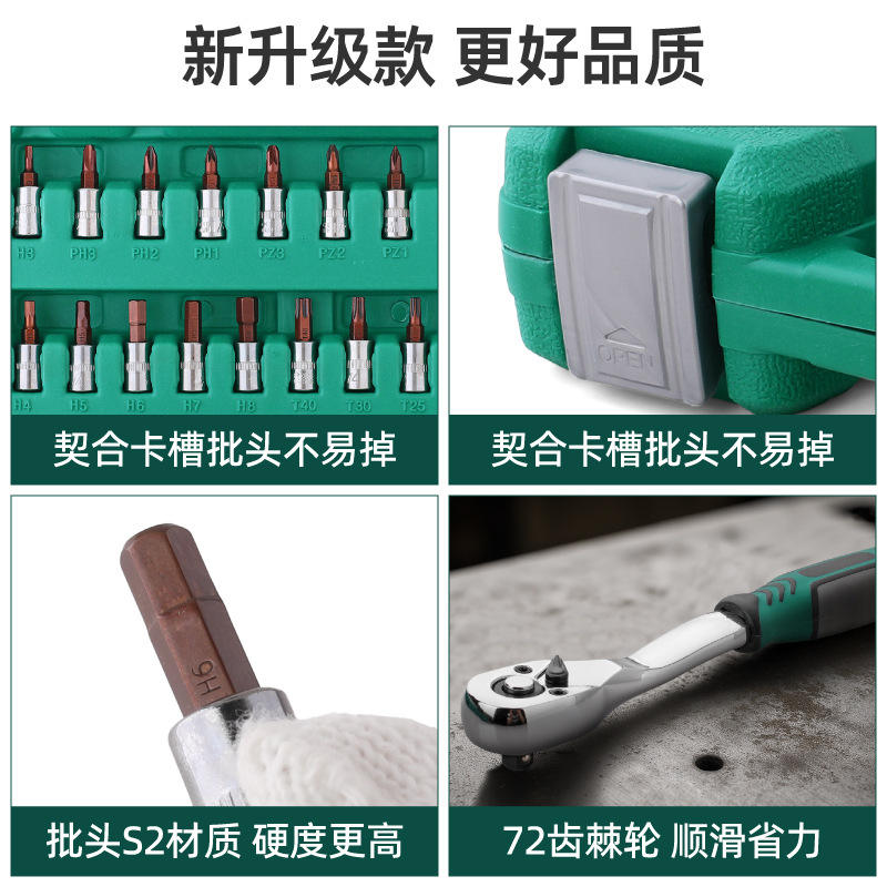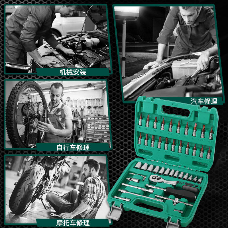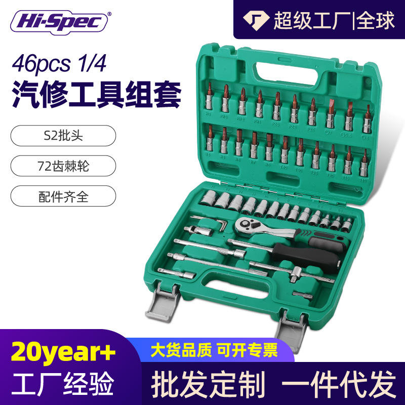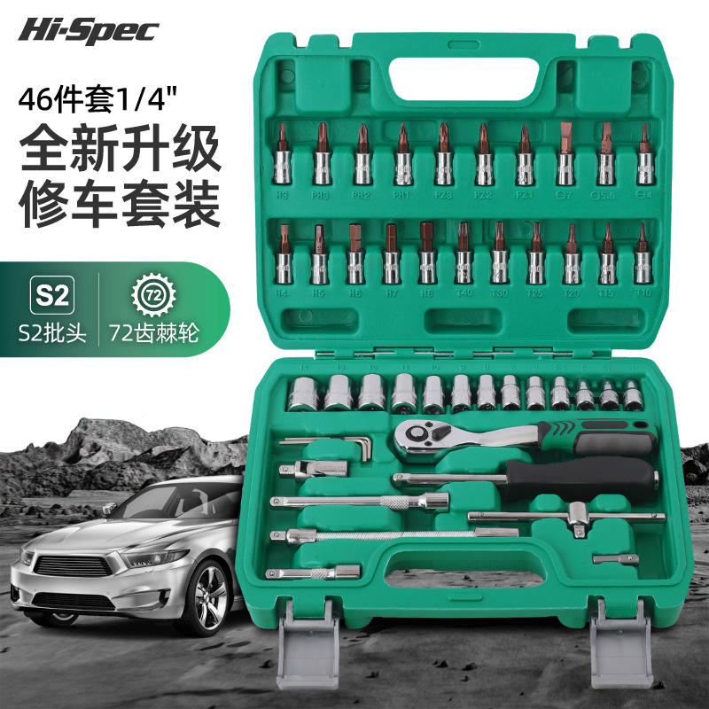 ชุดประแจบล็อก 46 ชิ้น ขนาด 1/4 นิ้ว ผลิตจากเหล็กกล้าคาร์บอนอเนกประสงค์ สำหรับซ่อมแซมรถยนต์และบ้าน บรรจุในกล่องสีเขียว
