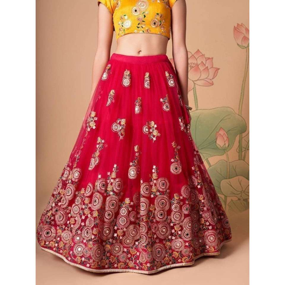 ชุดเลเฮนกาโชลีงานแต่งงานสีชมพูสดแบบตาข่ายปักลายกระจก น้ำหนัก 3000 กรัม/2500 กรัม แบบกึ่งสำเร็จรูป