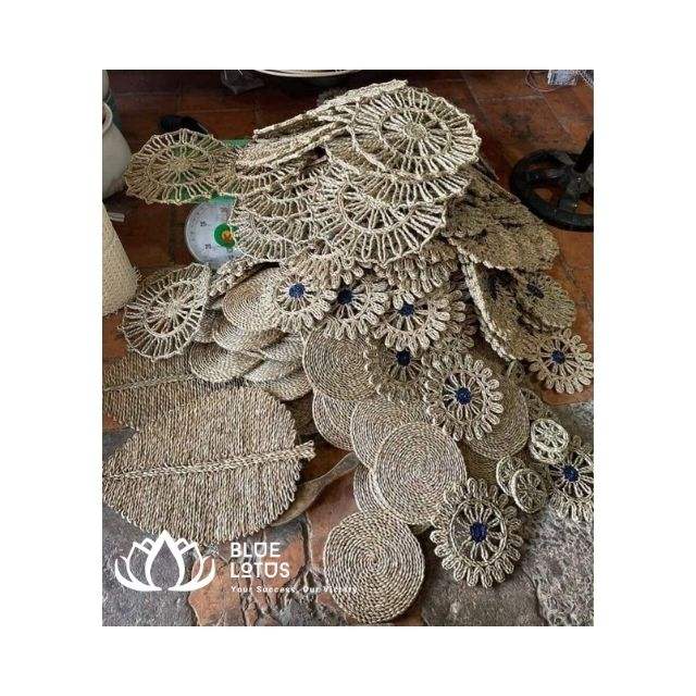 แผ่นรองจานทรงใบหญ้าทะเลขนาดกลางแผ่นฟางแบบสั่งทำสำหรับสิ่งทอเฟอร์นิเจอร์บ้านดอกบัวสีน้ำเงิน