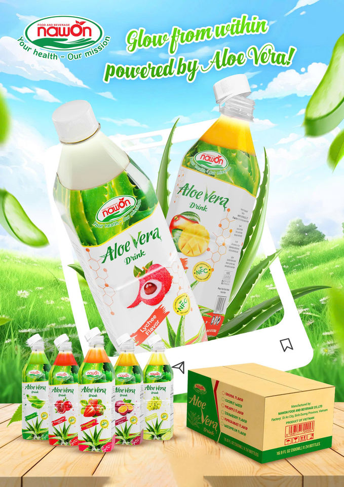 น้ำว่านหางจระเข้พรีเมียม รสลิ้นจี่ บรรจุขวด PET 500 มล. ขั้นต่ำในการสั่งซื้อน้อย มีตัวอย่างฟรี ผลิตโดยโรงงาน Nawon ในเวียดนาม ได้รับมาตรฐาน GMP รับผลิตแบบ OEM