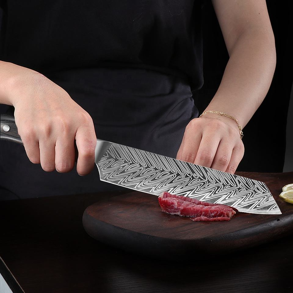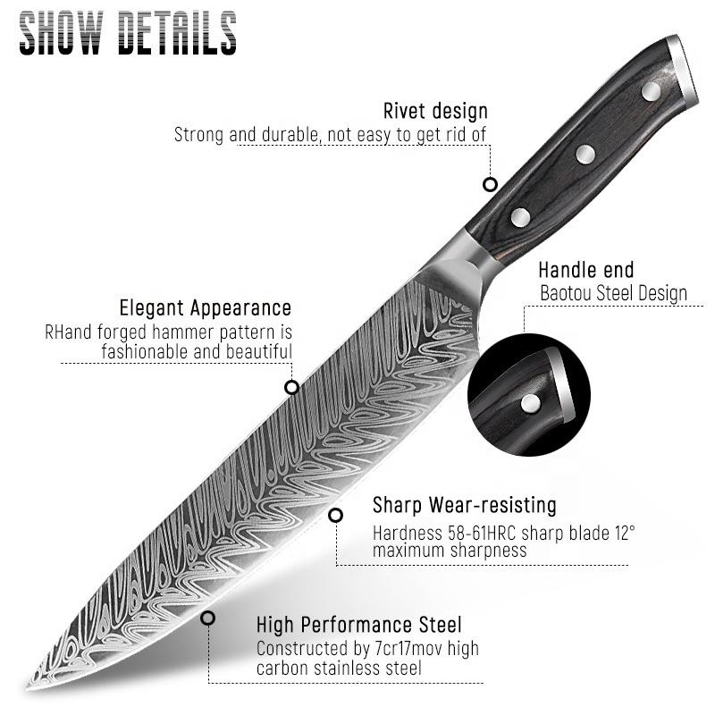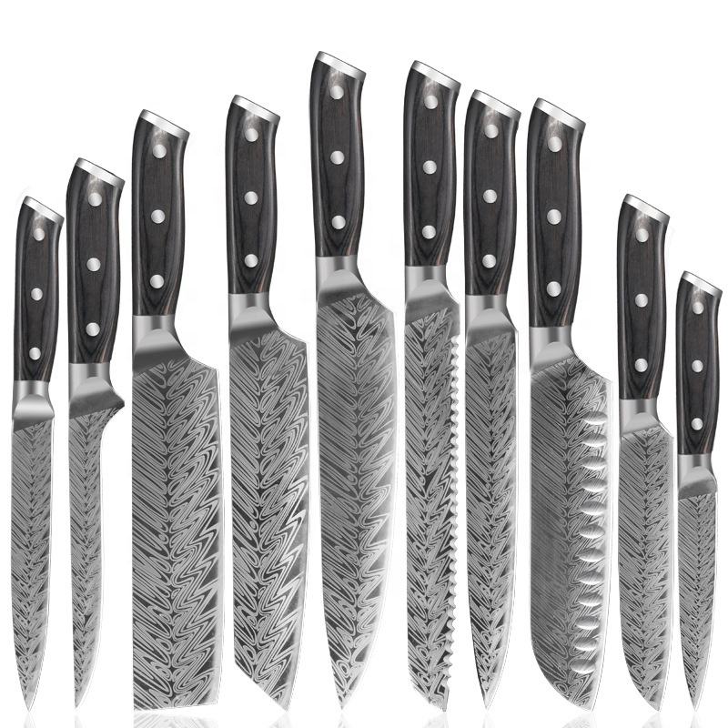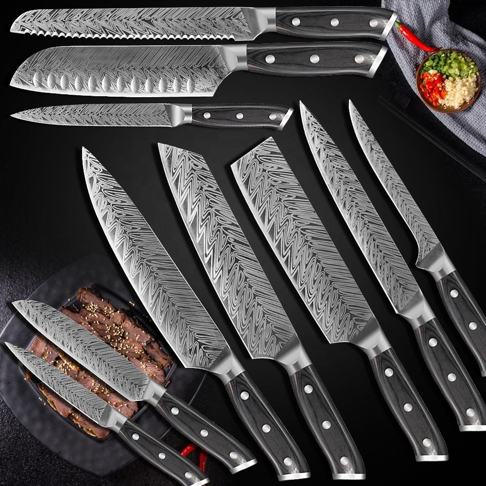 ชุดมีดทำครัว10ชิ้นพร้อมด้ามไม้ทำจากสเตนเลสคาร์บอนสูงลายดามัสกัส