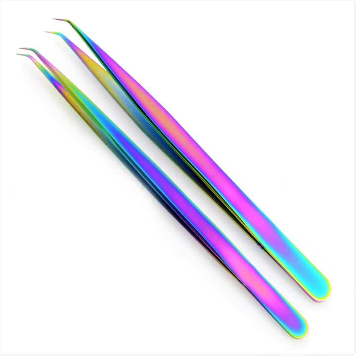คีมหนีบขนตาแบบบางทำจากสเตนเลสสตีลขนาด4มม. เคลือบด้วยพลาสมาหลายสีรุ้ง45องศาแยกปลายแหลม