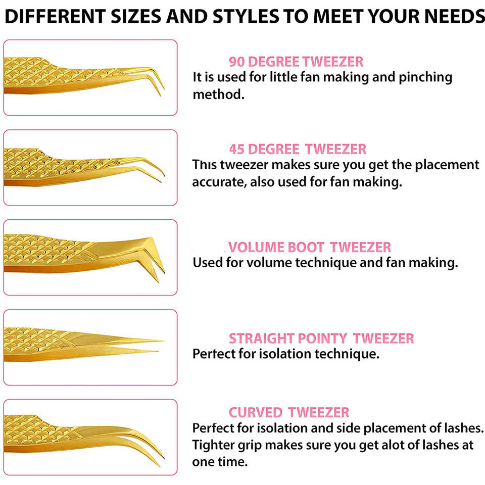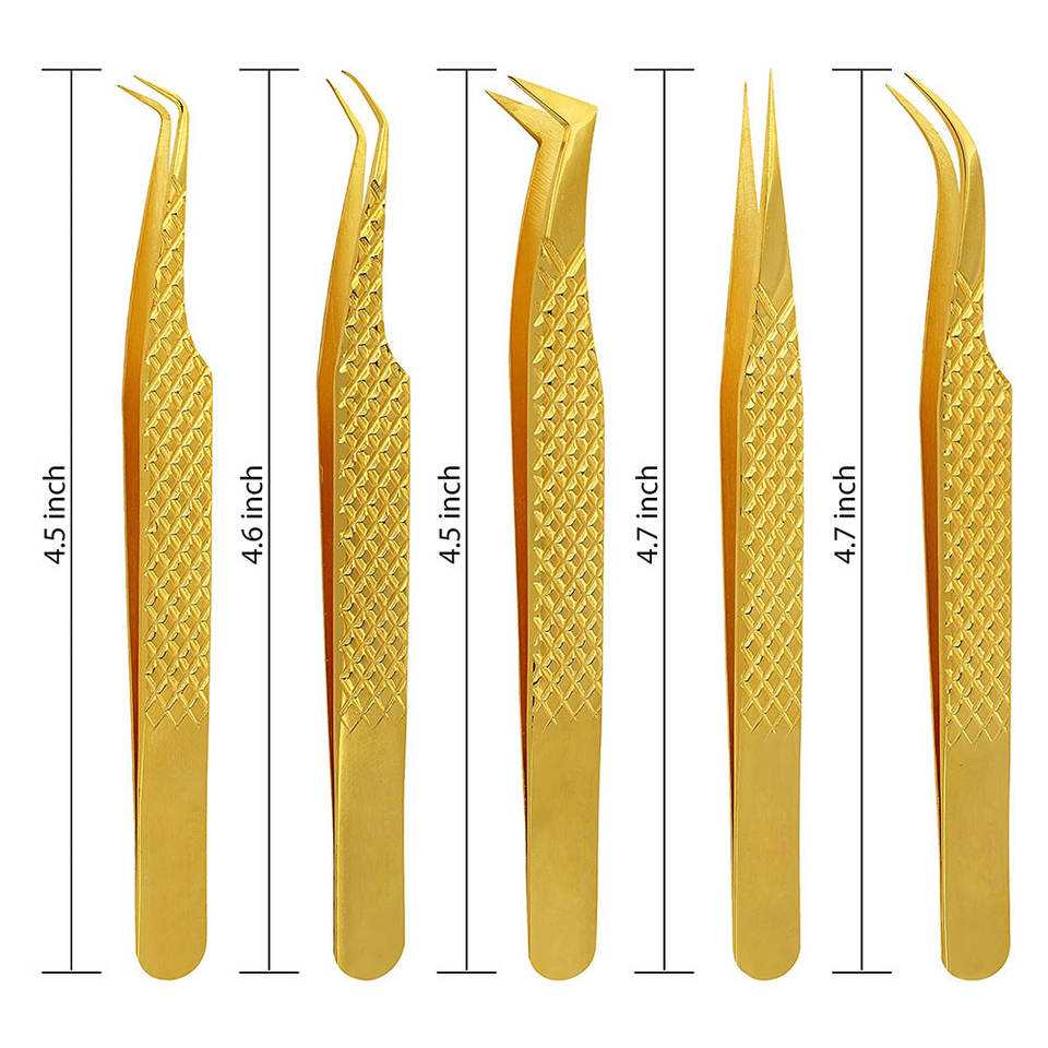 ชุดแหนบต่อขนตาแบบมืออาชีพ 5 ชิ้น สแตนเลสสตีลสีทอง อุปกรณ์เสริมความงามสำหรับต่อขนตาแบบวอลุ่ม แบบตรง แบบโค้ง 45/90 องศา ขนาด 10 มม.