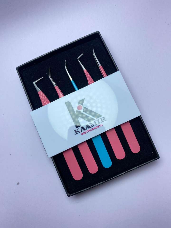 ชุดแหนบต่อขนตาสเตนเลสสีชมพู5ชิ้นแบบมืออาชีพชุดปลายแหลมที่แตกต่างกัน OEM